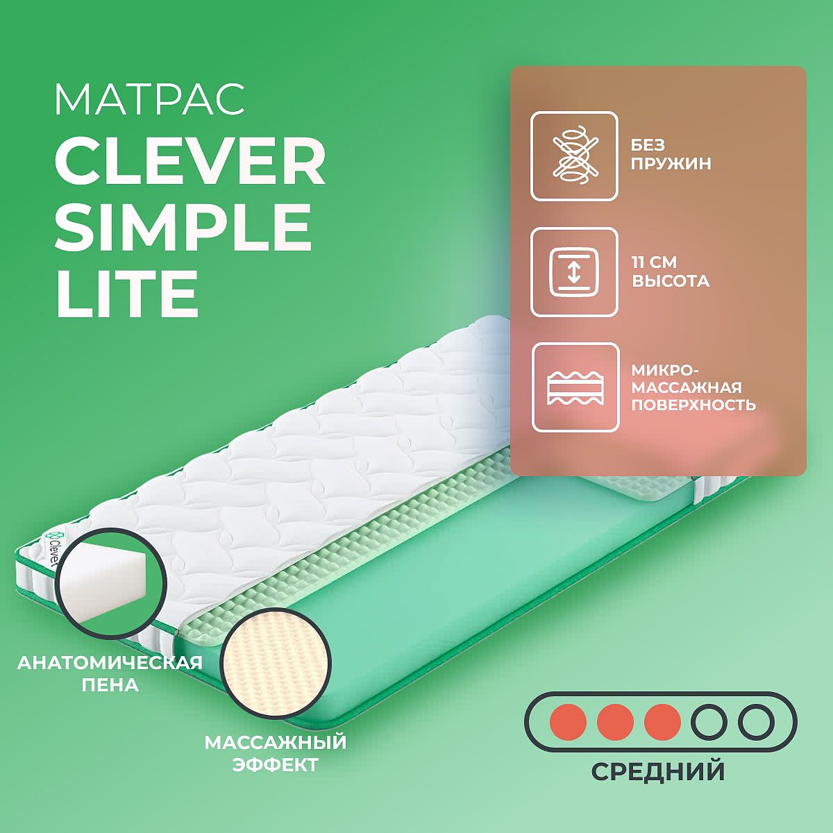 Матрас «Clever Simple Lite» — средней жесткости, которая комфортна большинству людей среднего телосложения. Это — универсальный вариант и детям, и взрослым, и пожилым людям.