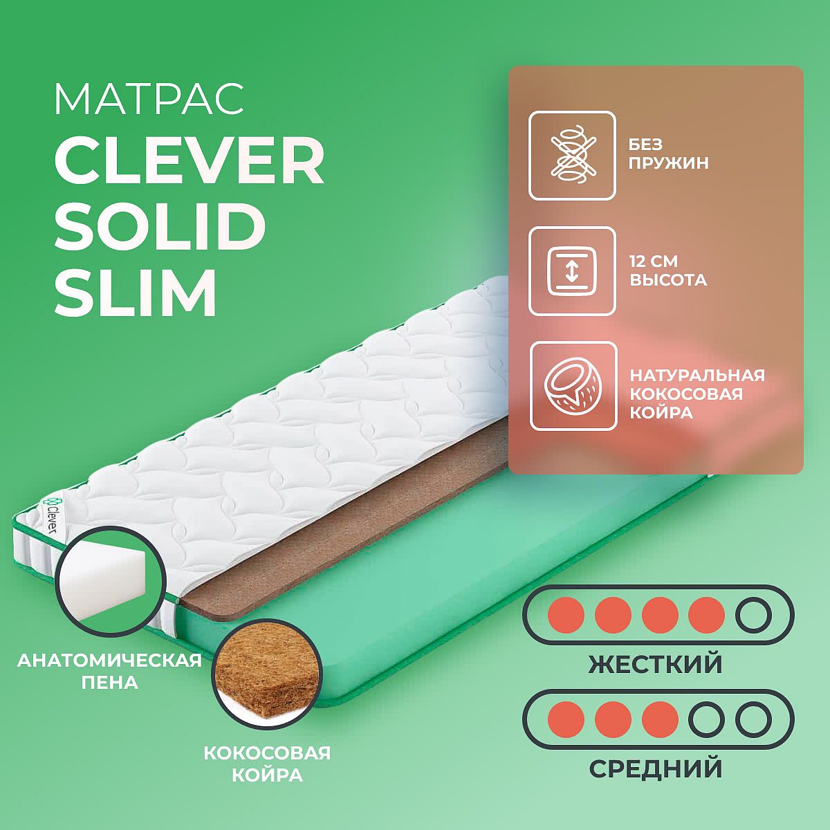 Нагрузка на спальное место, кг: 110. Высота, см: 12. Матрас Solid Slim имеет разную жесткость по сторонам — высокую и среднюю и выполнен всего из двух материалов: пенополиуретана и кокосовых волокон. Пенополиуретан выполняет роль основы, а кокосовая койра делает поверхность жестче. Кокос способен оказать правильную поддержку для позвоночника. Специальная пропитка не позволяет волокнам впитывать влагу, что положительно влияет на гигиенические свойства спального места.
