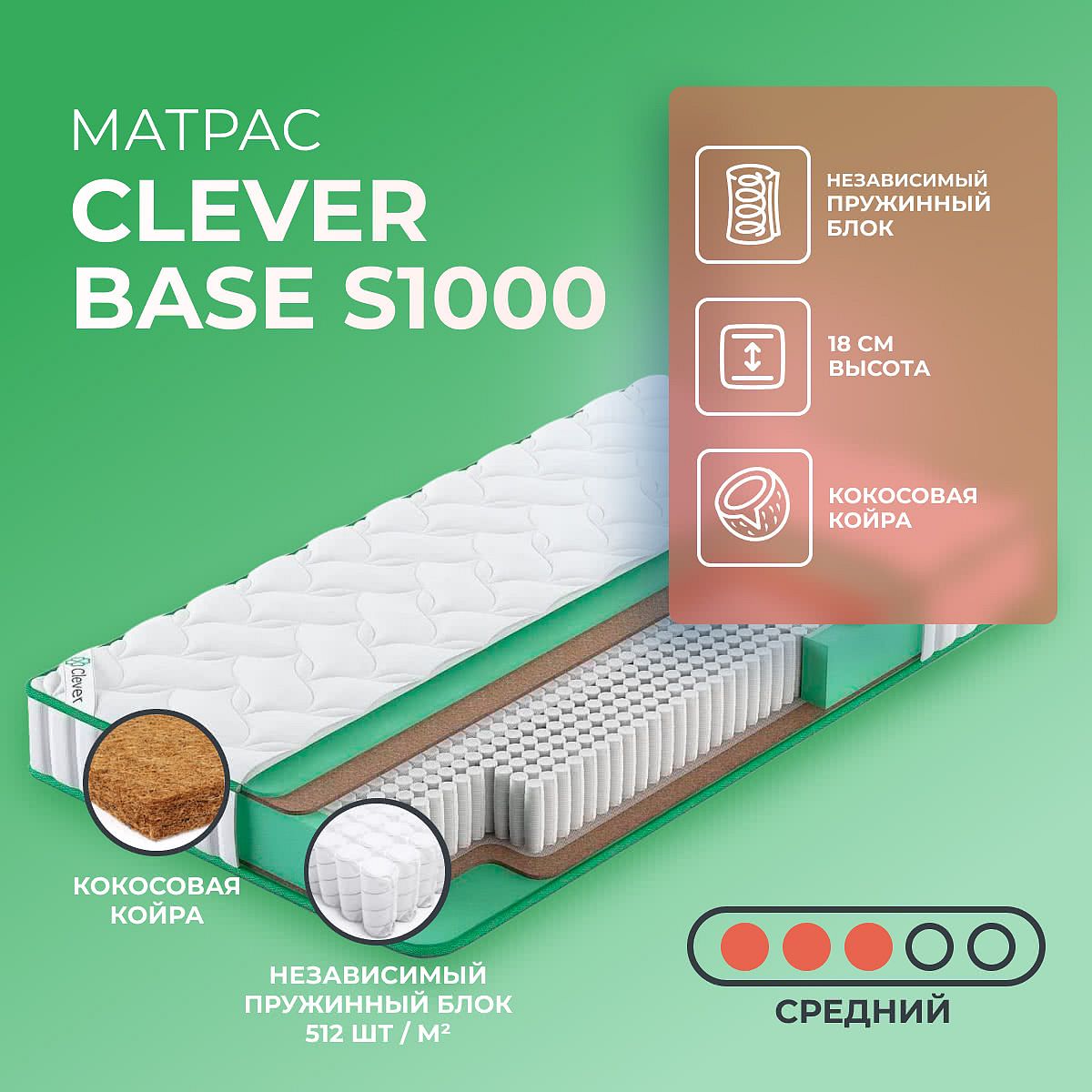 Матрас «Clever Base S1000» — средней жесткости, которая подходит большинству людей среднего телосложения. Это — оптимальный выбор и детям, и взрослым, и пожилым людям.