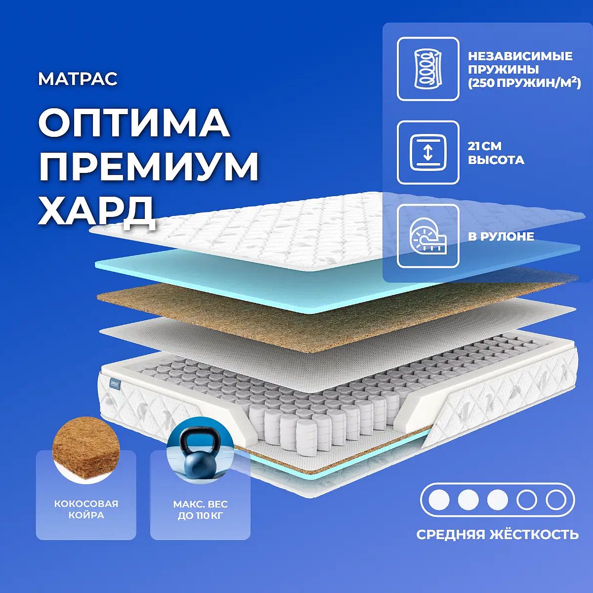 Матрас Оптима Премиум хард рассчитан на нагрузку не более 110 кг на одно спальное место.