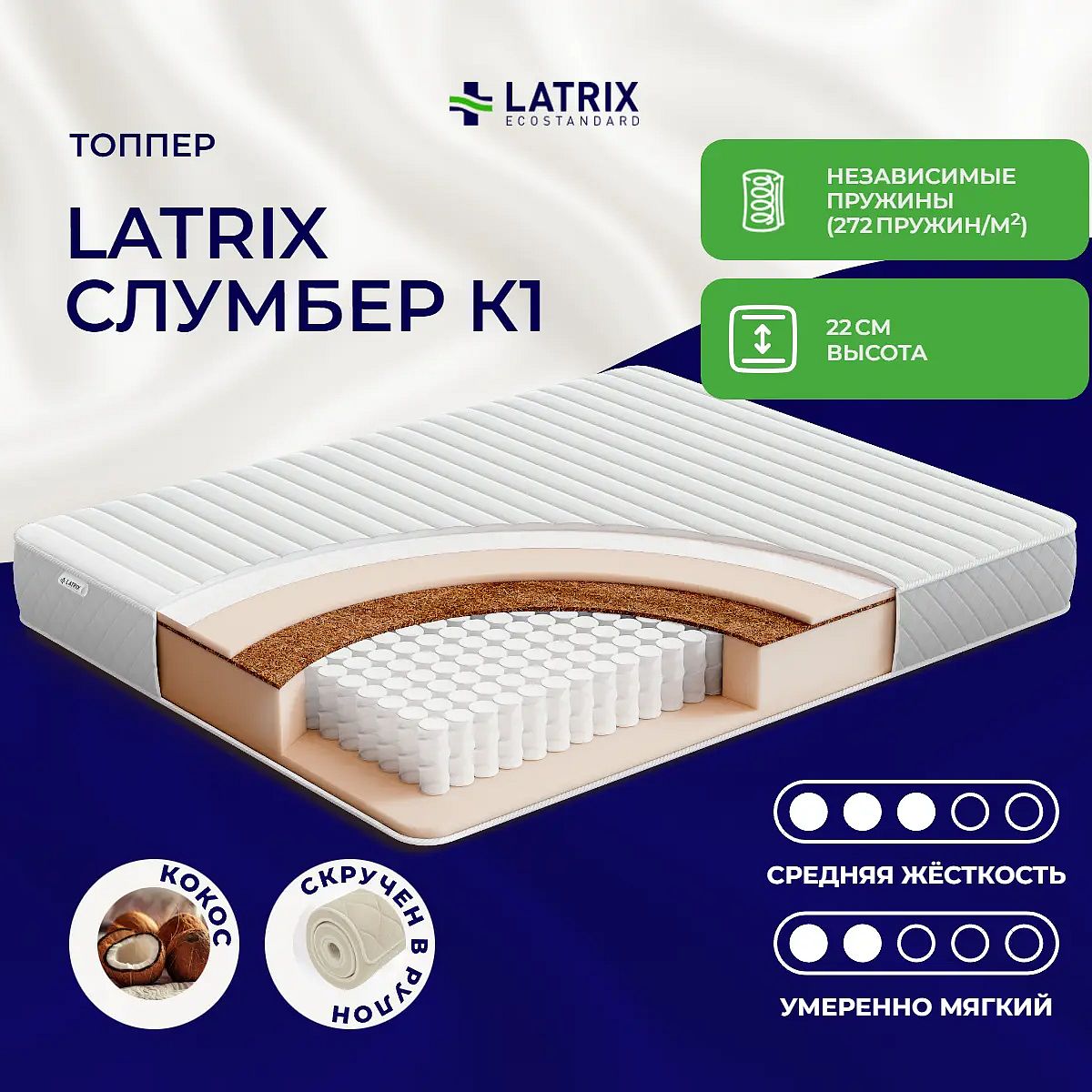 Кокос — натуральный материал, койра отлично дышит, придает матрасу «Слумбер К1» жесткость и упругость.