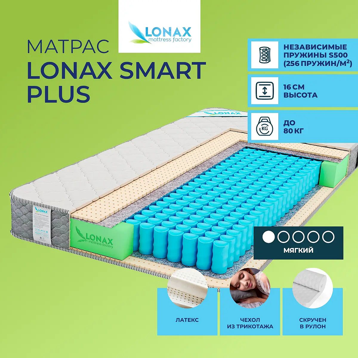 По умолчанию матрас поставляется в развернутом виде. По Вашему желанию матрас может быть скручен в рулон. Максимальный размер матраса, доступный для скрутки - 200х200. Наполнение моделиМодель изготавливается на основе натурального наполнителя – латекса – и придется по душе всем любителям мягких поверхностей. Латекс способен подстраиваться под все изгибы тела спящего, полностью его расслаблять, а также снимать болевые ощущения в различных участках тела. Кроме того, это материал гипоаллергенный, то есть не вызывающий аллергии.Особенность работы пружин TFKБазируется модель на блоке пружин TFK. Это современная конструкция состоит из 256 микропружин на 1 кв. метр. Пружины имеют одинаковый размер и выполнены в форме бочонков, а также помещены в специальные чехлы. Это позволяет нагрузке распределяться равномерно, точечно воздействовать на тело спящего и позволять ему принимать естественное положение во время сна.Трикотажный чехолЧехол матраса изготавливается на основе трикотажной ткани и простеган на синтепоне.Защита матрасаЧтобы обеспечить защиту спального места рекомендуем купить защитный наматрасник-чехол или водонепроницаемый наматрасник. Он предотвратит появление пятен, грязи и пыли на вашем матрасе, а также увеличит эксплуатационный срок всего изделия.Другие моделиПосмотрите также другие модели серии Light: мягкую – Lonax Smart и средне-жесткую – Lonax Polo Plus.