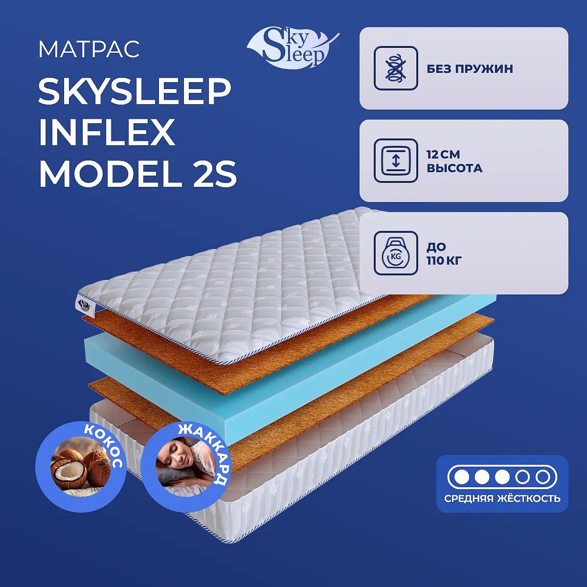 Матрас Skysleep InFlex Model 2s — это качественный беспружинный матрас средней жесткости, созданный для комфортного сна и поддержки тела. Благодаря сочетанию слоев кокоса и пенополиуретана, он обеспечивает оптимальный баланс упругости и мягкости, подходит для ежедневного использования взрослым с весом до 110 кг. Высота матраса — 12 см. С обеих сторон одинаковая конструкция: жесткость выше средней, что делает его универсальным выбором для большинства пользователей. Состав и ощущения