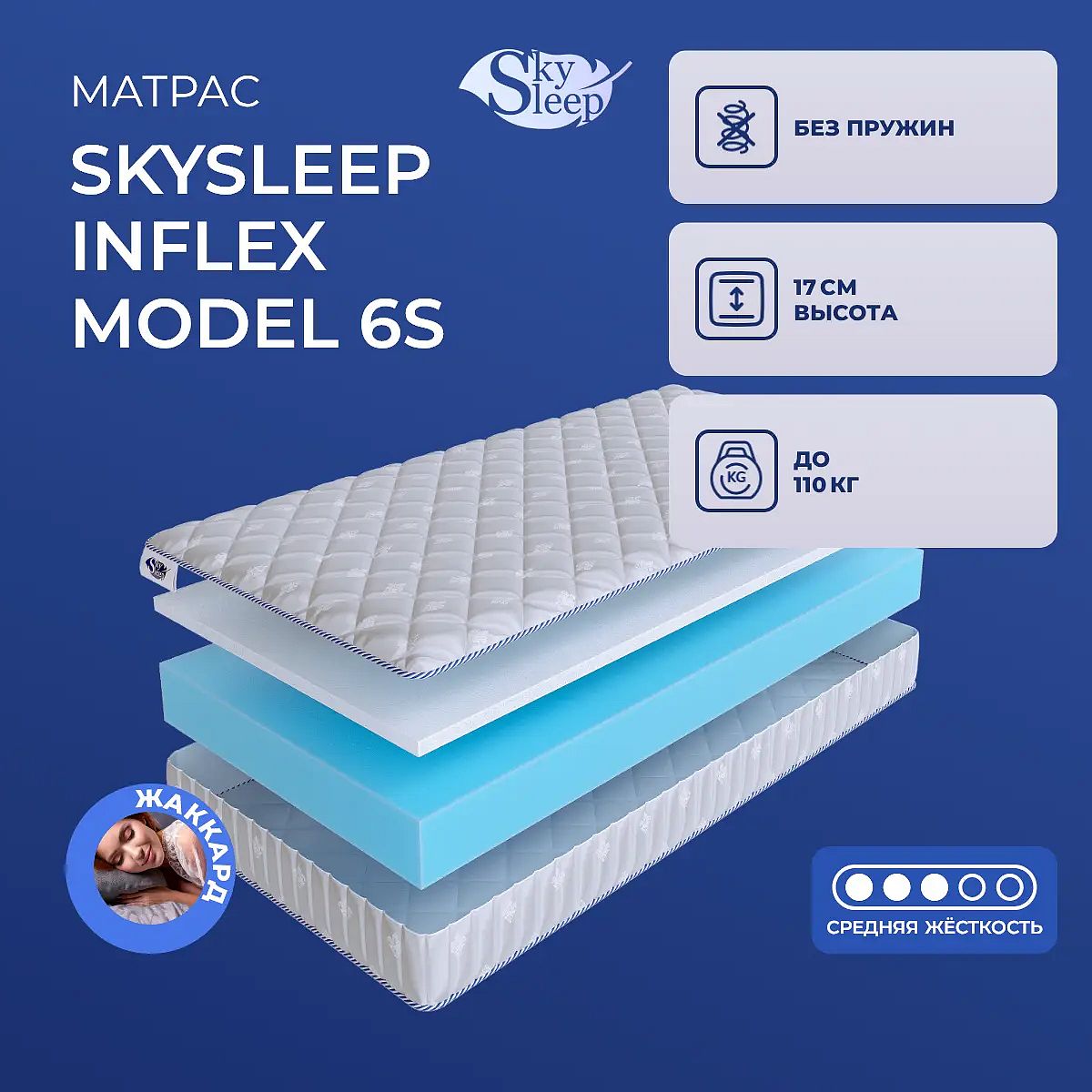 Матрас Skysleep InFlex Model 6s — это качественный беспружинный матрас средней жесткости, созданный для комфортного сна и ежедневного использования. Благодаря комбинации современных материалов, матрас обеспечивает надежную поддержку и приятные ощущения в течение всей ночи. В основе матраса — два слоя с разными характеристиками: упругий холлофайбер толщиной 3 см и плотный слой пенополиуретана (ППУ) высотой 14 см. Такой состав способствует хорошему распределению нагрузки и поддержке тела. Синтетический жаккардовый чехол с простежкой на синтепоне (100 г/м2) делает поверхность матраса аккуратной, приятной на ощупь и устойчивой к износу. Skysleep InFlex Model 6s выдерживает нагрузку до 110 кг на одно спальное место и подходит для большинства людей со средним телосложением. Матрас не имеет пружин, что делает его особенно удобным для тех, кто предпочитает ровную и устойчивую поверхность без эффекта покачивания. Ключевые особенности