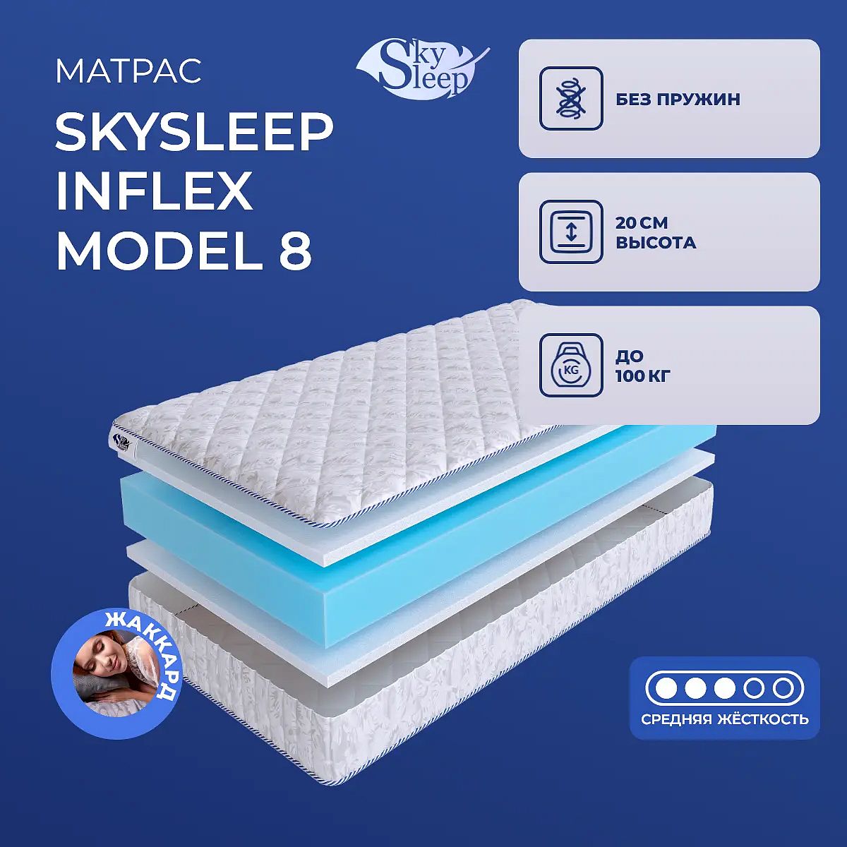 Матрас Skysleep InFlex Model 8 — это беспружинный матрас средней жесткости, созданный для ежедневного комфортного сна. Высота 20 см обеспечивает удобную посадку на кровати и оптимальную поддержку для стандартного матраса. Слои холлофайбера и пенополиуретана равномерно распределяют нагрузку, помогая сохранять форму и поддерживать тело без ощущения избыточной мягкости или жесткости. Чехол выполнен из хлопкового жаккарда со стежкой на синтепоне (100 г/м2), что делает поверхность приятной к коже и устойчивой к износу. Матрас рассчитан на нагрузку до 100 кг на одно спальное место, подходит для большинства пользователей с разным типом телосложения. Ключевые особенности