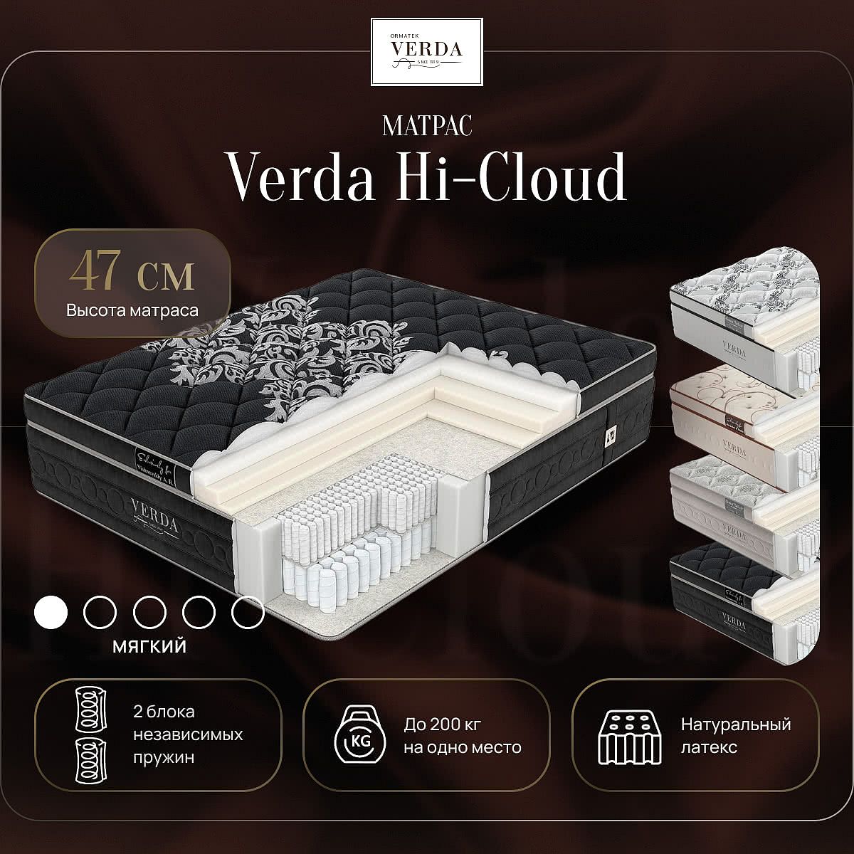 Допустимая разница в весе, кг: 80. Жесткость: низкая. Высота, см: 47. Все модели матрасов Verda доступны в 4-х цветовых вариантах чехла, каждый из которых отличается уникальным рисунком. Чехлы матрасов Verda имеют максимальное двойное наполнение гипоаллергенным материалом Micro 400, отличающимся особой стойкостью к многочисленным деформациям. Микроволокно этого наполнителя в 2 раза тоньше, чем у обычных полиэфирных наполнителей.
